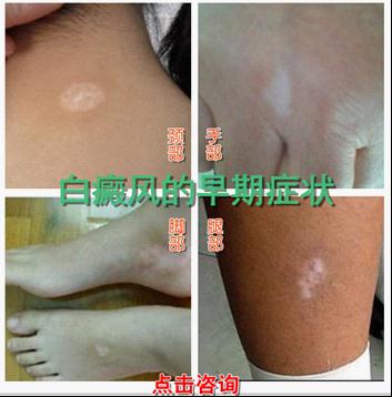 主要表现为:皮肤上的白色、乳白色斑界限清楚,大小形态不一,白斑处毛发可变白。色班皮肤无萎缩、硬化及脱屑等变化。多见于面、颈、手背等部位,无自觉症状。